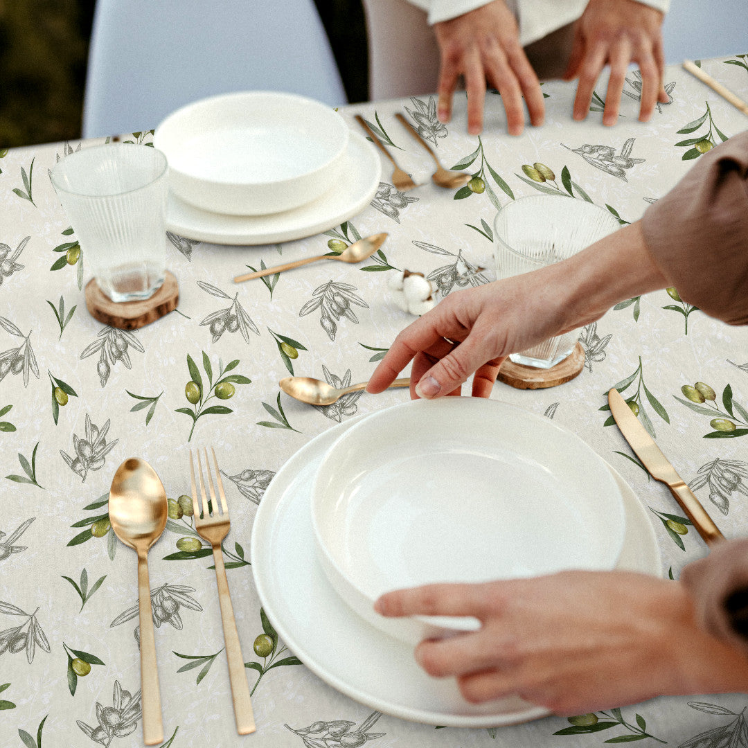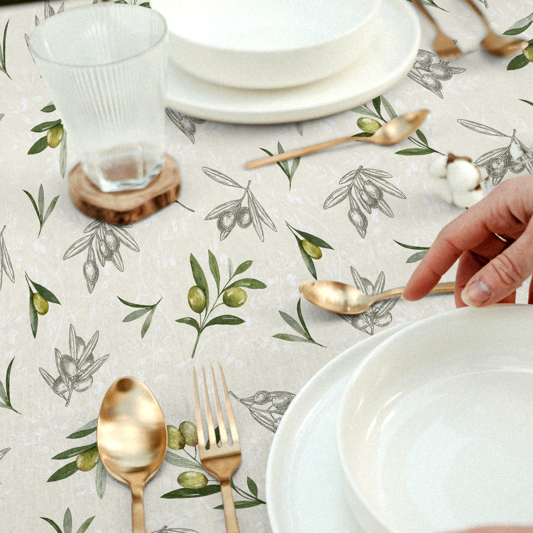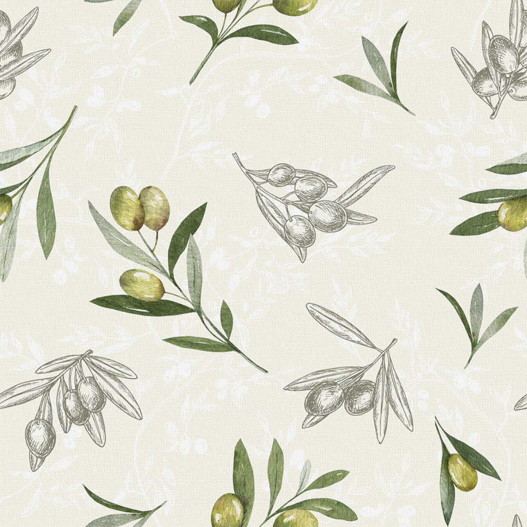 En sjarmerende akrylduk med akvarelltegnede olivengreiner i naturlige grønntoner, kombinert med fine strekillustrasjoner i grått. Alt hviler på en myk offwhite bakgrunn, der et lett mønster i bakgrunnen gir duken karakter og dybde. Uttrykket er en blanding av klassisk landlighet og lett vintage-stemning – perfekt både til hverdagsbordet og lange sommerkvelder.