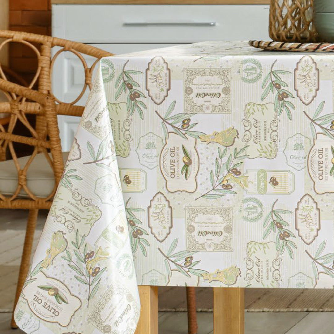 Oliven i pastell – voksduk i lyse pastellfarger med olivenkvister og etiketter
