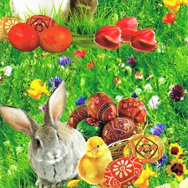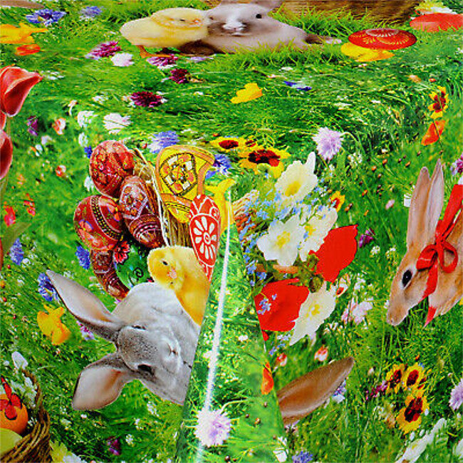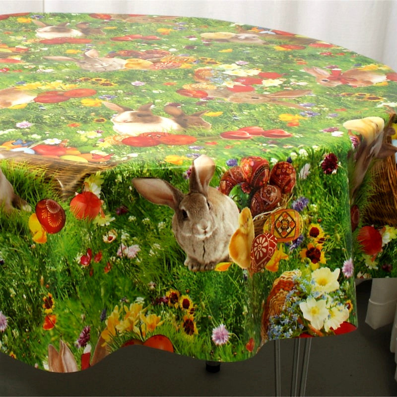 Påskefest på Endelave, voksduk med påskeegg, kyllinger, kaniner og hareunger