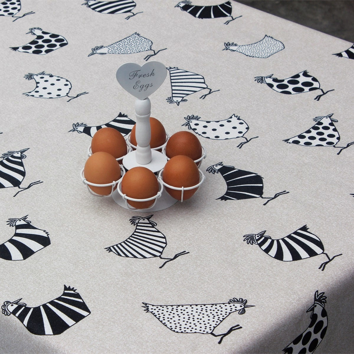 Rego, akrylduk med morsomme høner, 140 cm bred er i restordre og sendes så snart varen er på lager igjen.