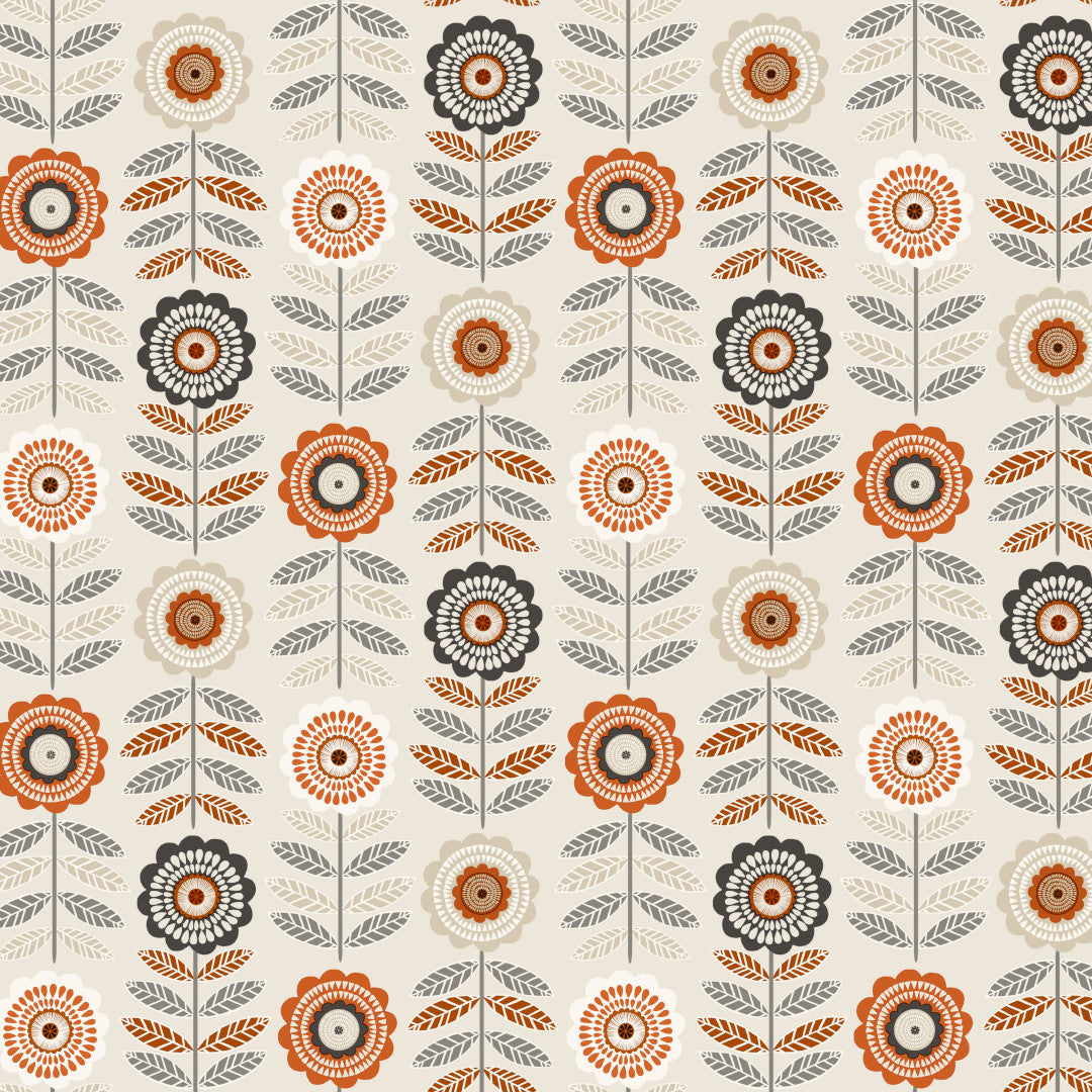 Retroblomst er en dekorativ voksduk med et stilisert blomsterprint inspirert av klassisk retrodesign. Den kremfargede bunnen danner en rolig bakgrunn for de grafiske blomstene i varme nyanser av oransje, beige og grå, som gir bordet et karakteristisk og levende uttrykk.