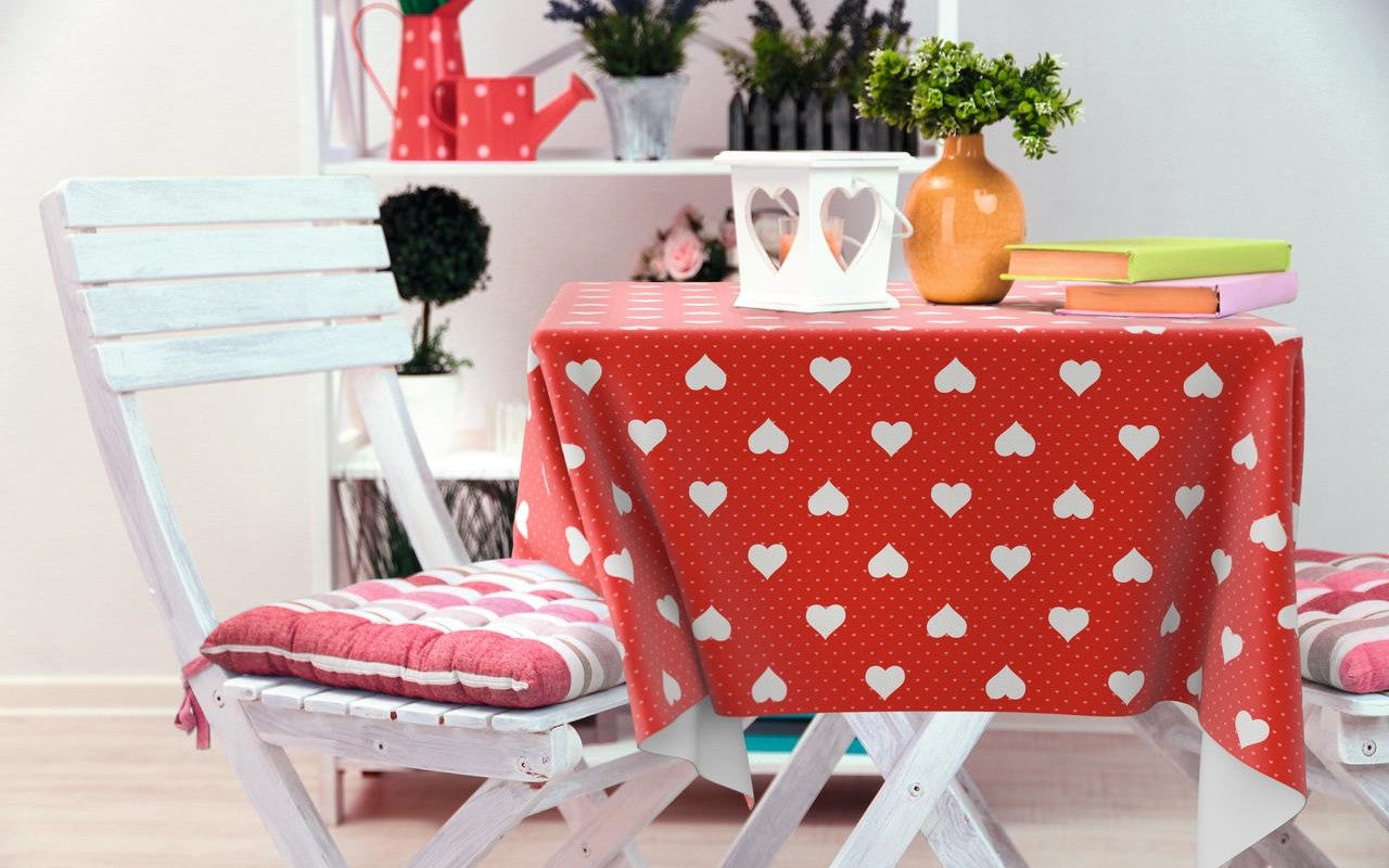 Navnet på denne kvalitetsvoksduken lyver ikke – det er nesten som om det svever romantikk i luften når du dekker bordet. Fargene den kommer i, er rød eller rosa – virkelig postkasserød og veldig rosa. Her vises den i rød.