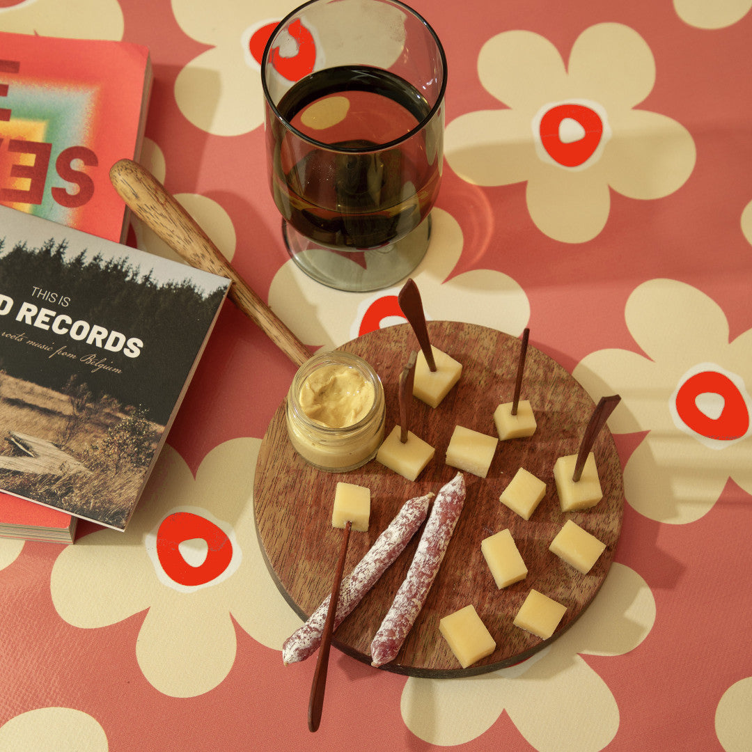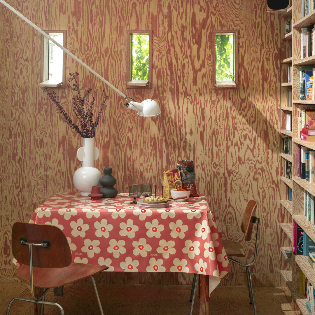 En voksduk med personlighet og særpreg. Small Big Flower Punch har et livlig blomstermønster i varme nyanser av lys beige og rødt mot en korallfarget bunn. Designet er enkelt, men fullt av energi og sjarm – perfekt for deg som vil tilføre litt farge og glede til bordet.