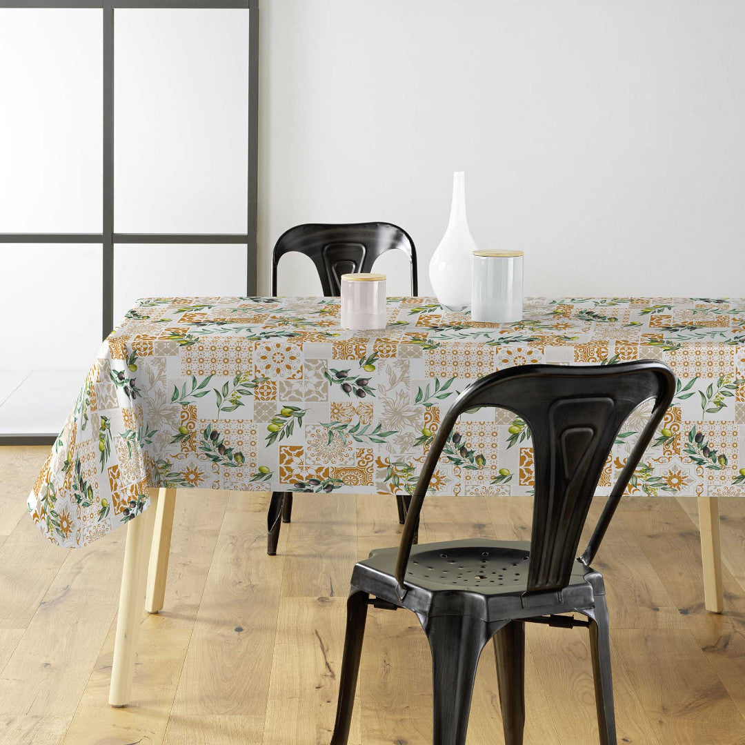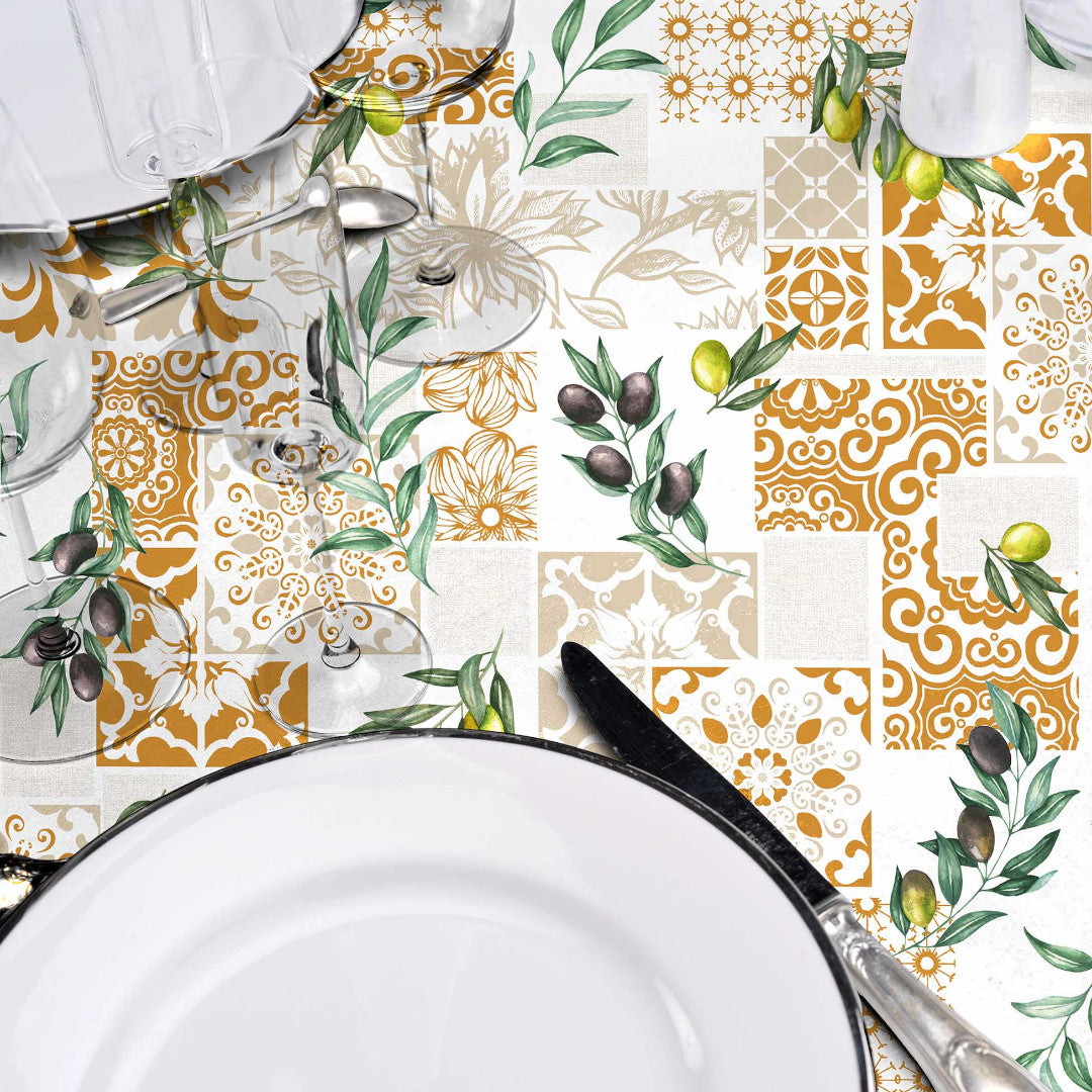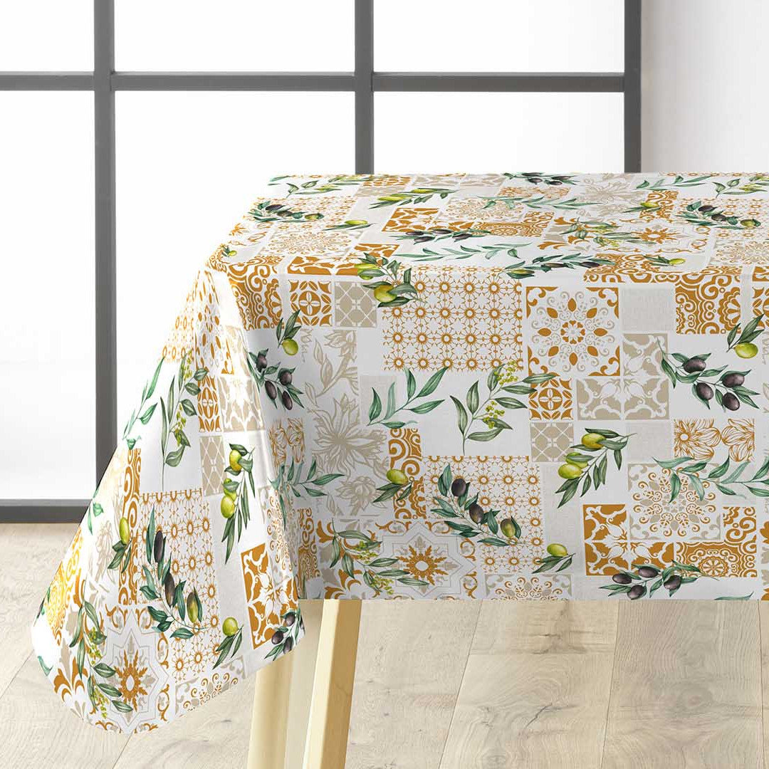 Solanova er en livlig voksduk med glatt overflate som bringer solrike assosiasjoner fra Middelhavet rett inn i spisestuen. Mønsteret kombinerer varme, gyldne fliser med detaljerte olivengrener i grønne og svarte nyanser – og skaper et friskt og stemningsfullt uttrykk.
