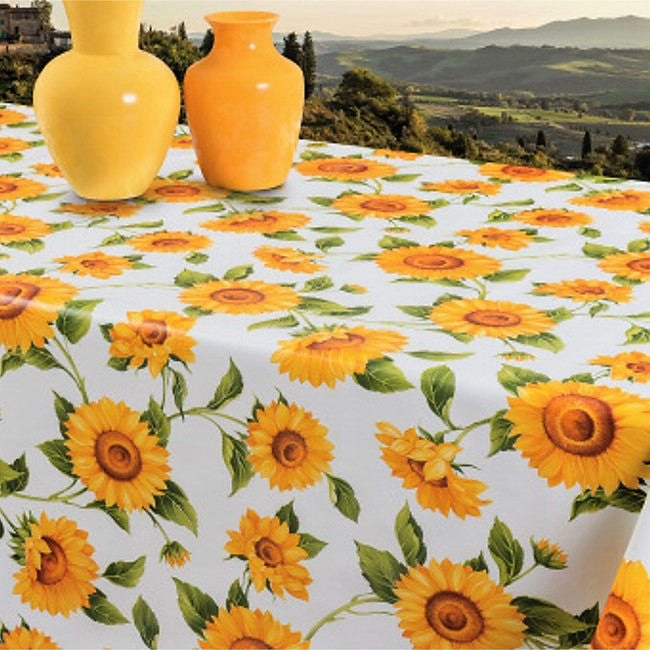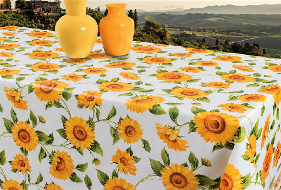 Solsikker – Voksduk i gule og oransje farger på hvit bunn, 160 cm bred