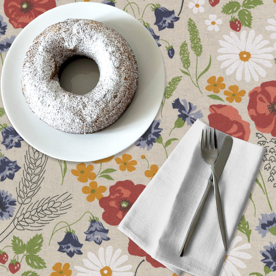 Bring den norske sommeren inn i hjemmet med Sommereng – en nydelig akrylduk i hørlook, fylt med markblomster, valmuer, kornblomster, prestekrager og små markjordbær. Det fargerike mønsteret oser av landlig idyll og gir borddekkingen et friskt og naturlig uttrykk.