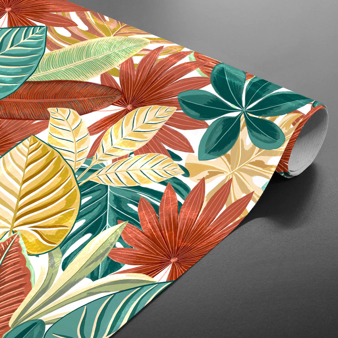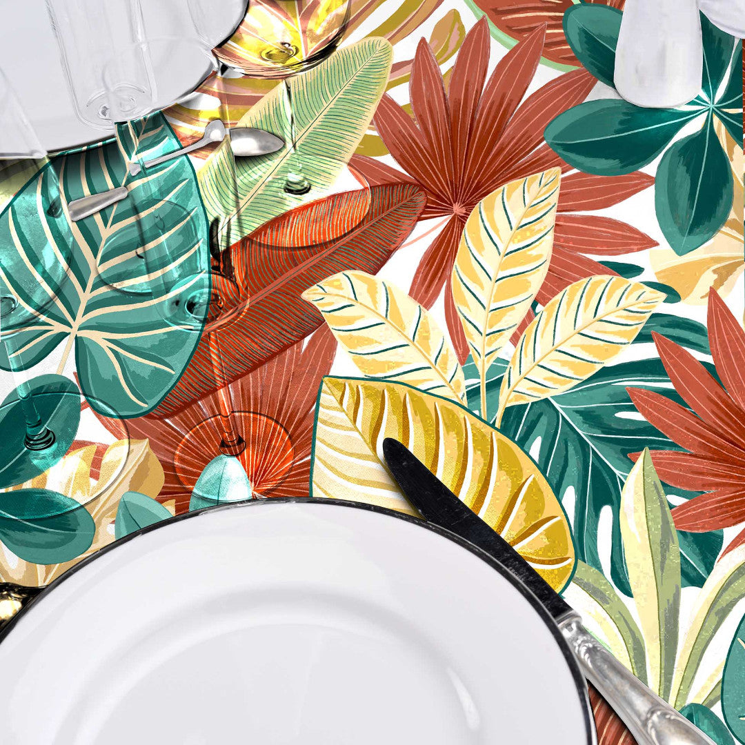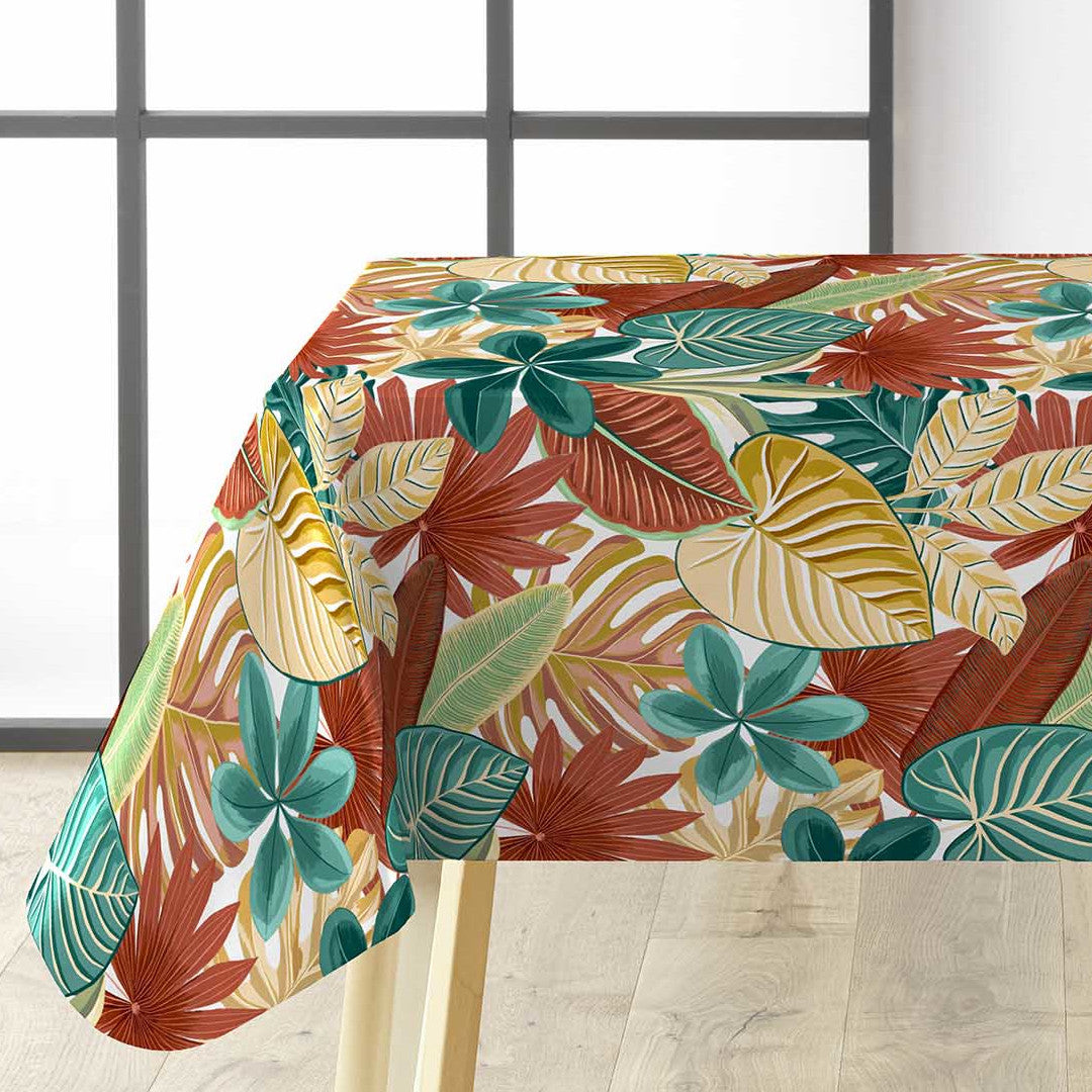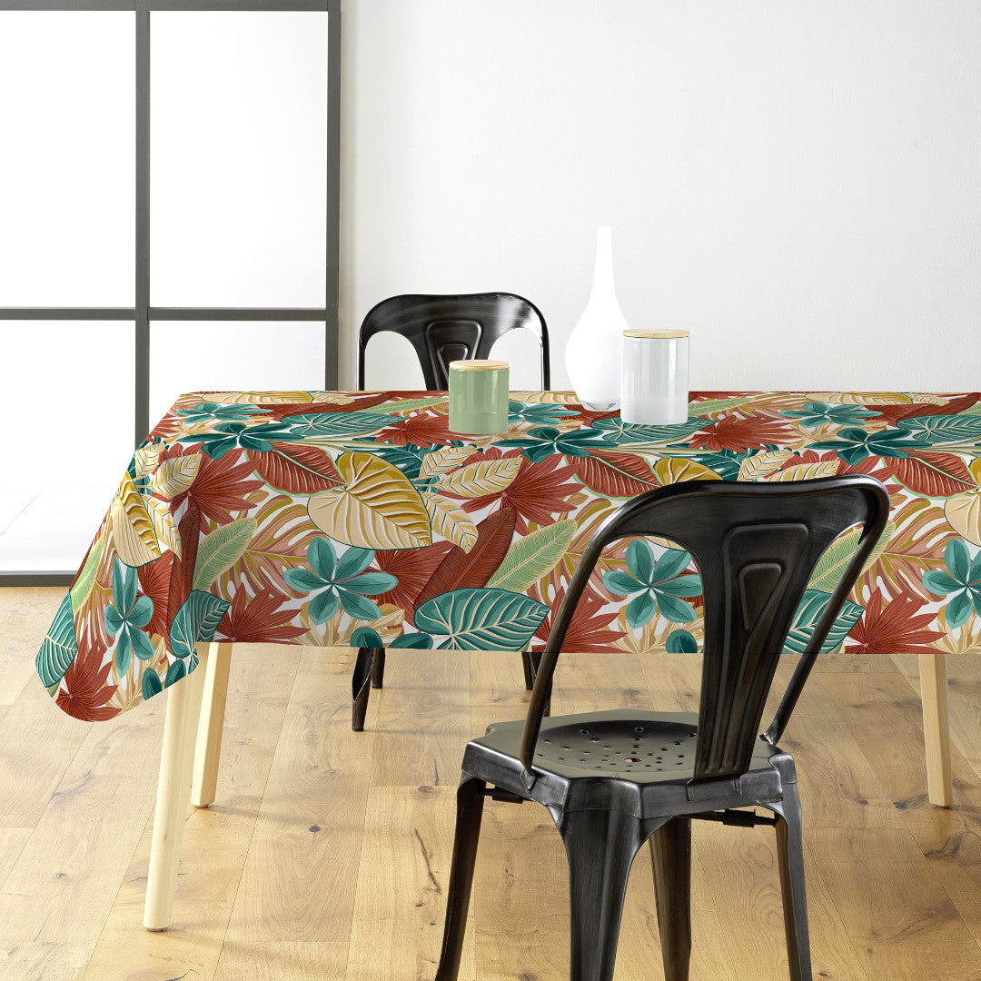 Textilia Ardenia er en livlig og karakterfull voksduk med et illustrert bladmønster som straks fanger blikket. De store bladene ligger tett og overlapper hverandre, noe som gir duken et frodig og nesten eksotisk uttrykk – uten at det blir overveldende.