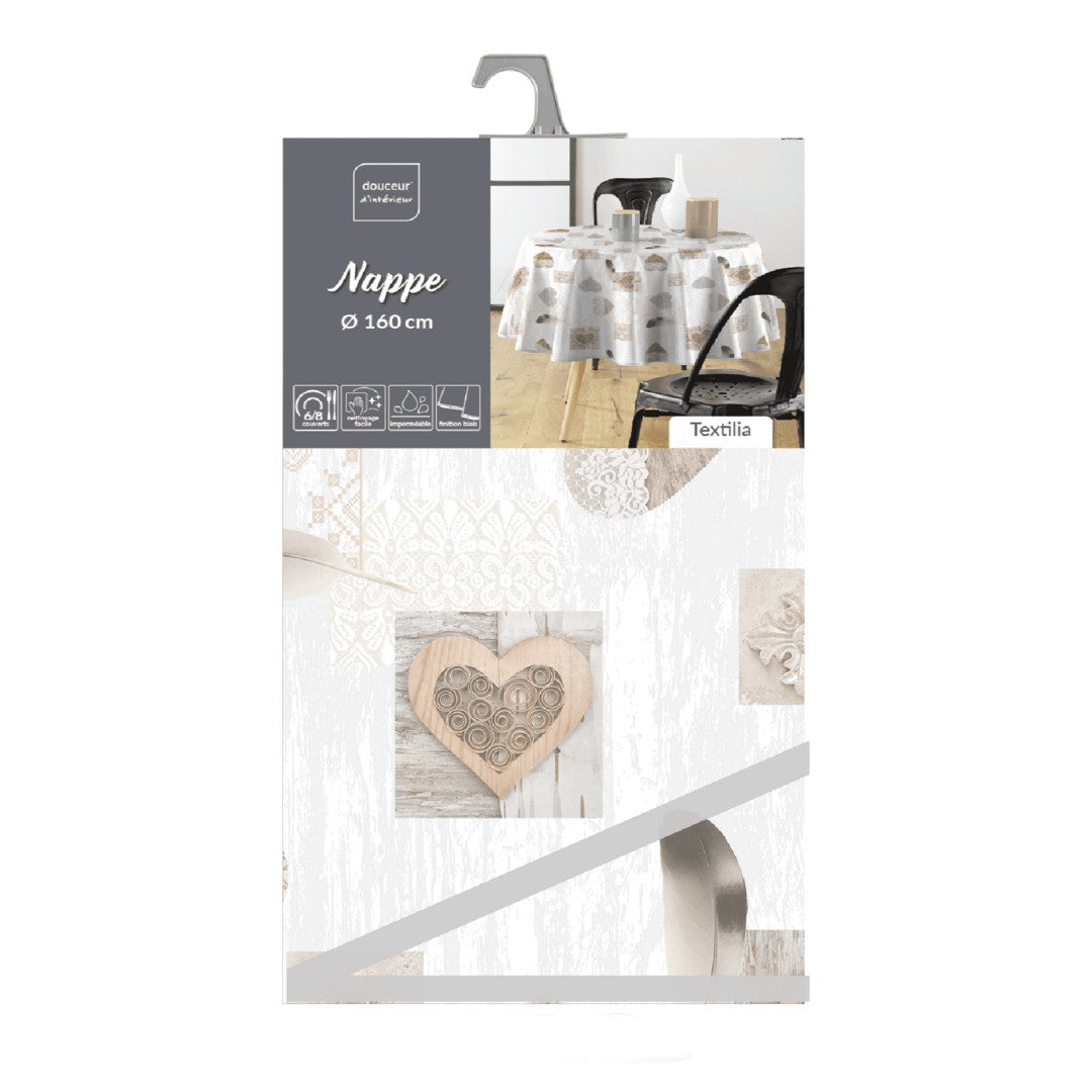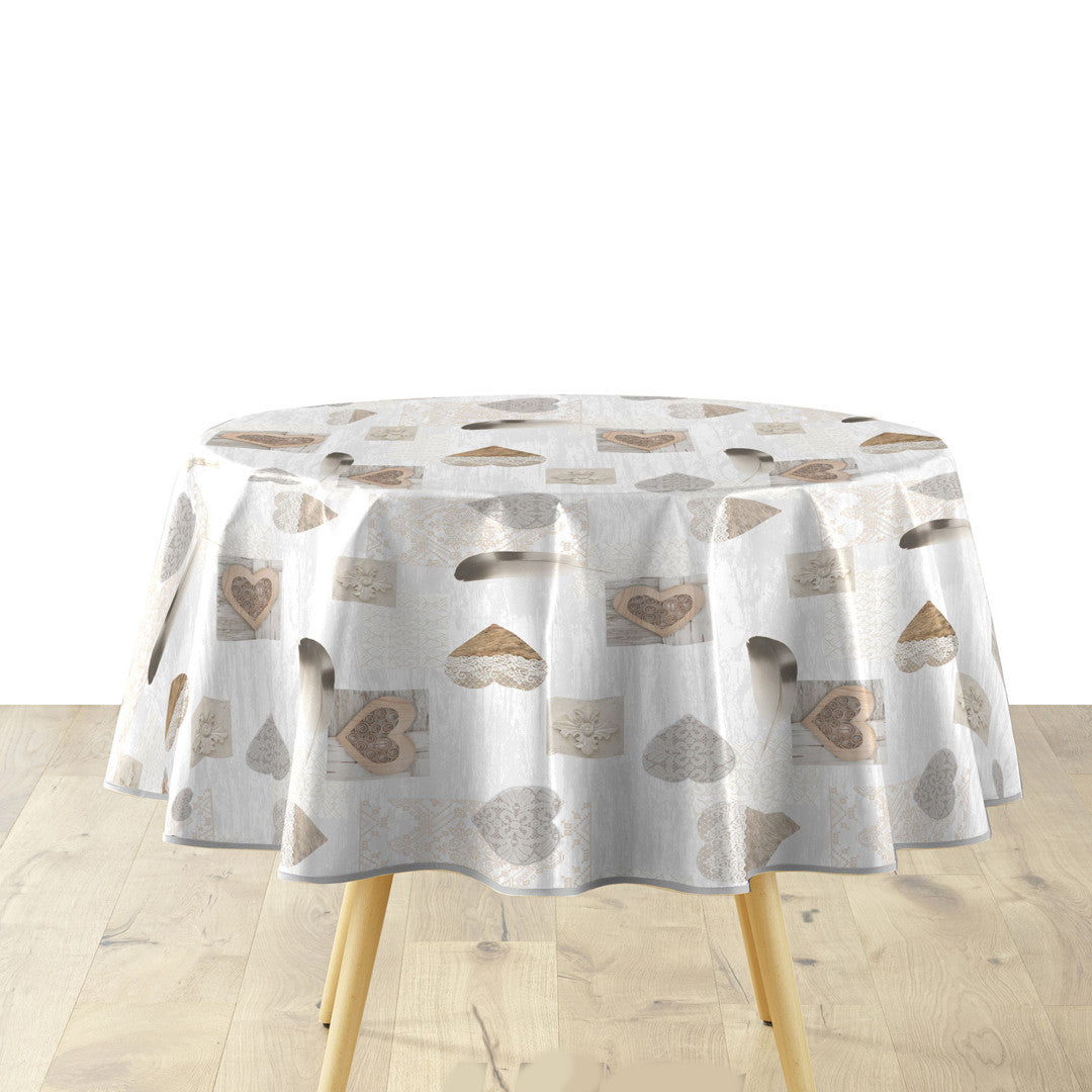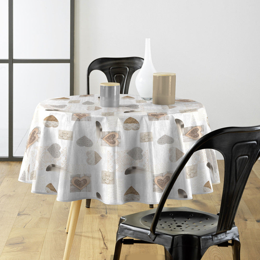 Textilia Delicia rund voksduk med hjerter, Ø 155 cm, skaper en varm og innbydende atmosfære i hjemmet. Duken er dekorert med fine hjerter og delikate mønstre i naturlige toner, som gir en hyggelig stemning rundt bordet. Enten du dekker til hverdag eller en spesiell anledning, beskytter den praktiske voksduken bordet mot søl og bevarer samtidig et stilfullt uttrykk.