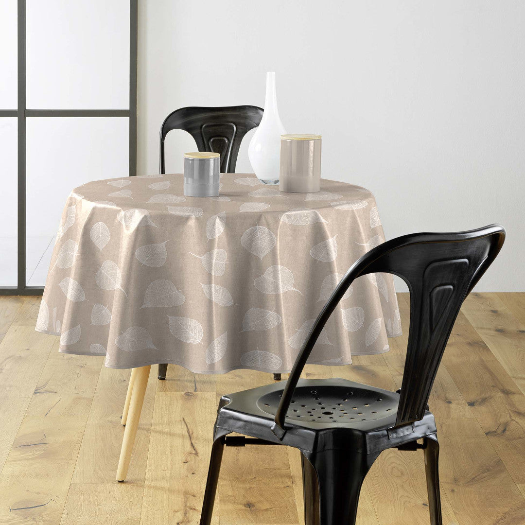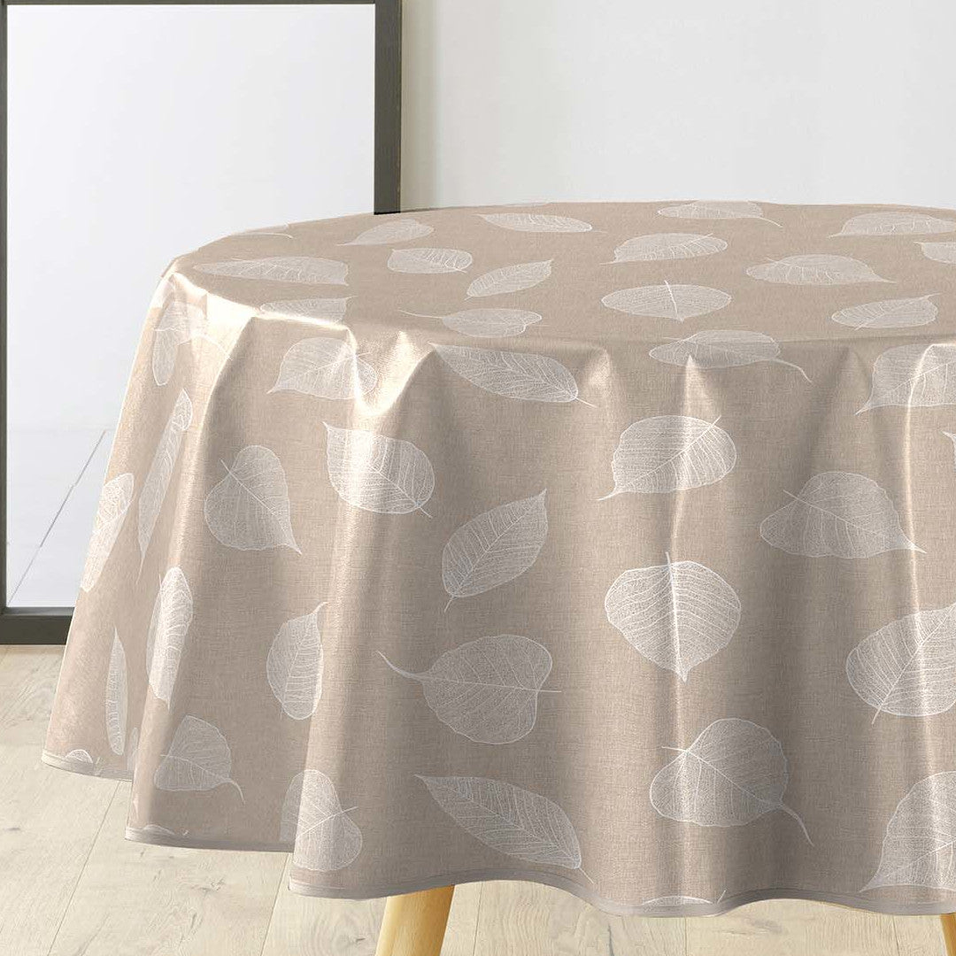 Textilia Feuillys - Rund voksduk i linlook med hvite strekblader, Ø 155 cm