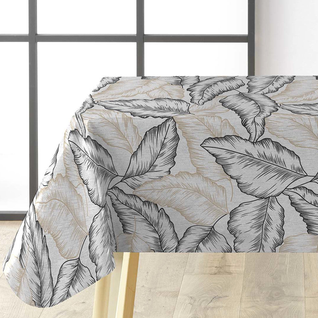 Textilia Glitter Arbena er en elegant voksduk med store, håndtegnede blader i svarte og beige nyanser. Mønsteret kommer vakkert frem mot den lyse, glitrende bunnen, som har en lett preget overflate og et tekstillignende uttrykk. Voksduken er både praktisk og dekorativ – enkel å tørke av og velegnet til både hverdagsbruk og når du får gjester.