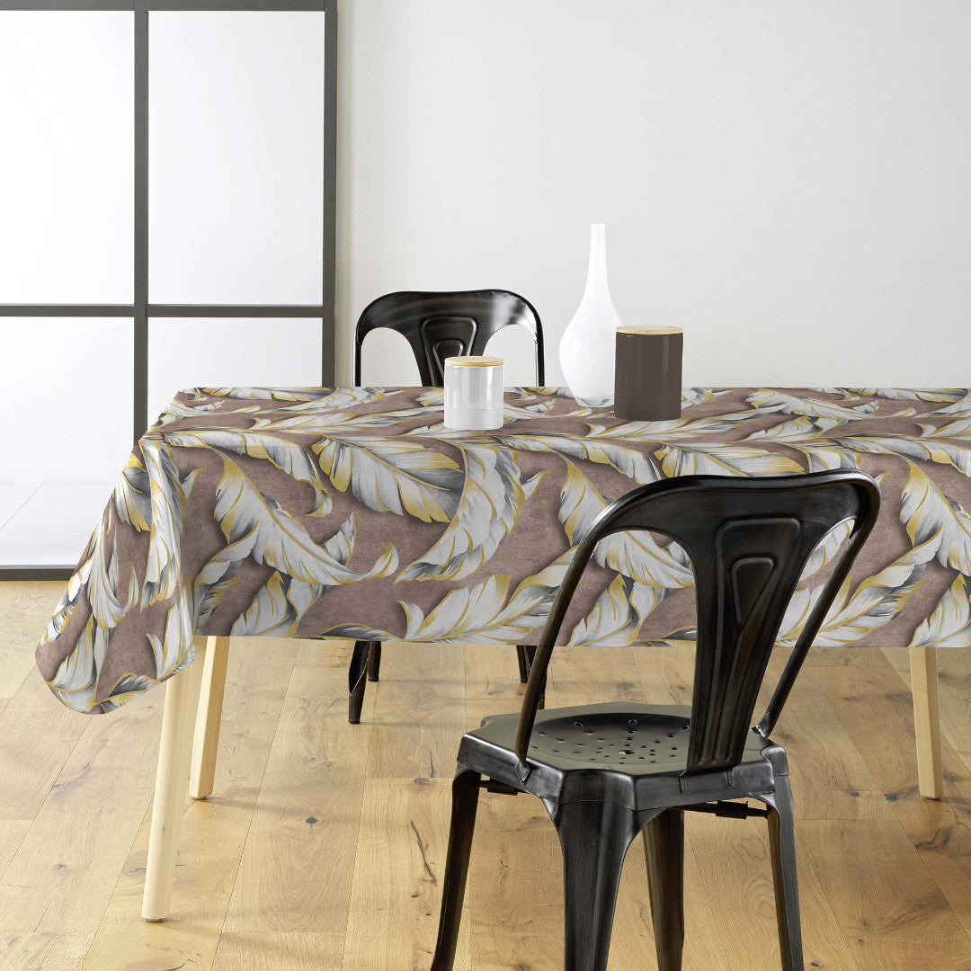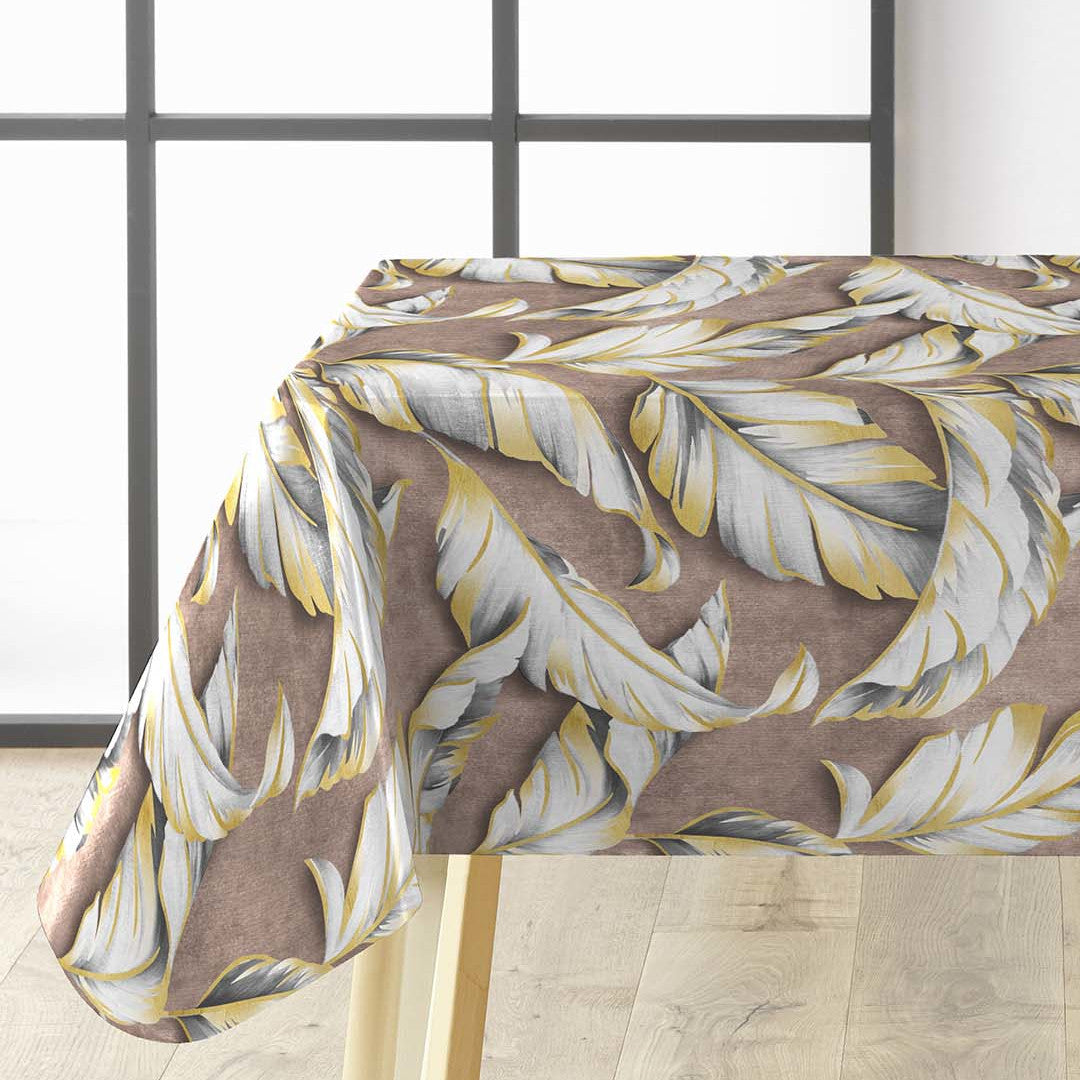 Fargene er dempede med et hint av glimmer som fanger lyset – uten å ta oppmerksomheten bort fra resten av borddekkingen. Bladmønsteret ligger på en varm brun bunn, som gir duken en lun og rolig tone. Et godt valg for deg som vil ha en voksduk med mønster som er både elegant og enkel i bruk.