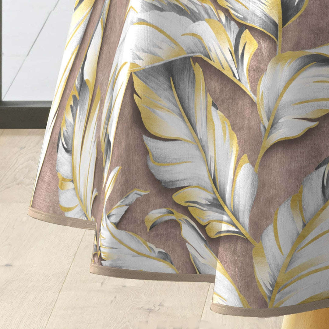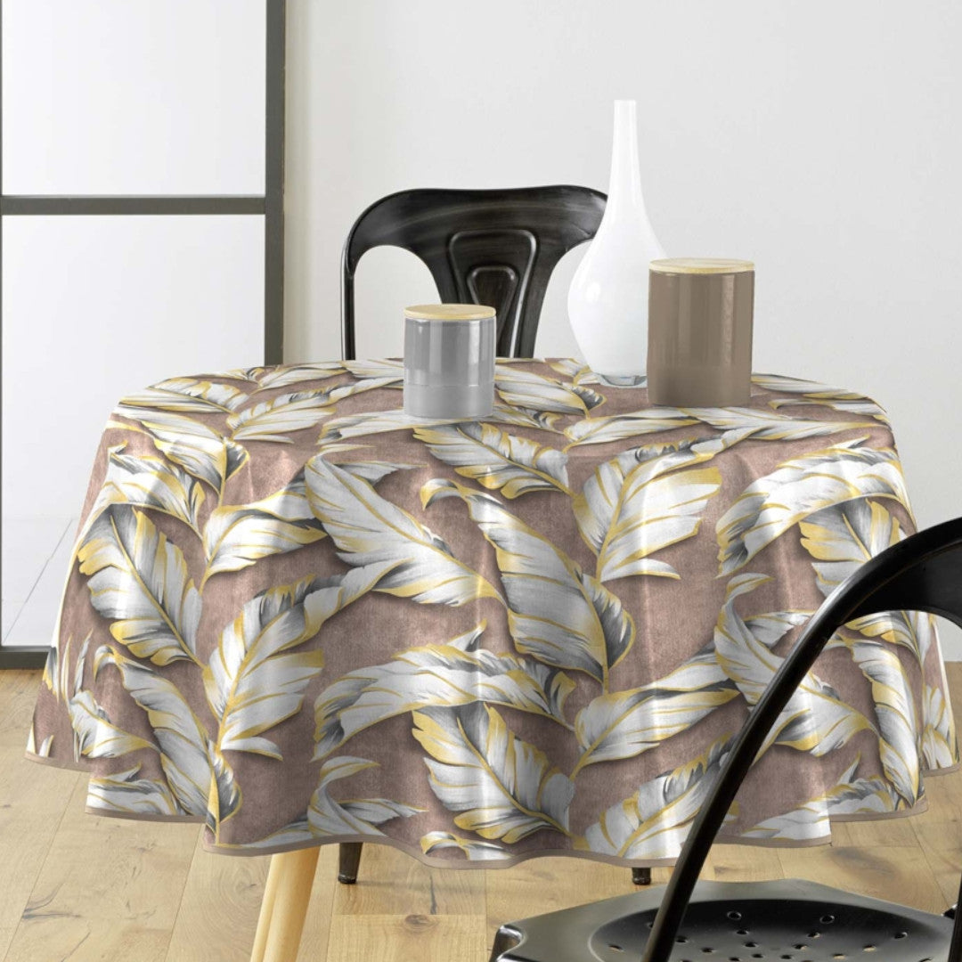 Textilia Glitter Ibany er en rund voksduk med et imponerende botanisk motiv i varme jordfarger og skinnende gulldetaljer. De store, håndmalte bladene i hvite, grå og gyldne nyanser gir et eksklusivt uttrykk, mens den dempede brunlige bunnfargen tilfører varme og dybde.