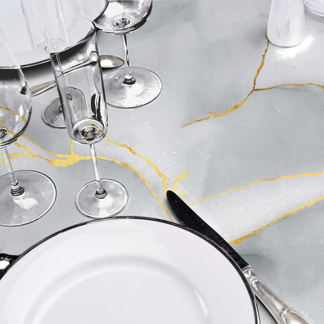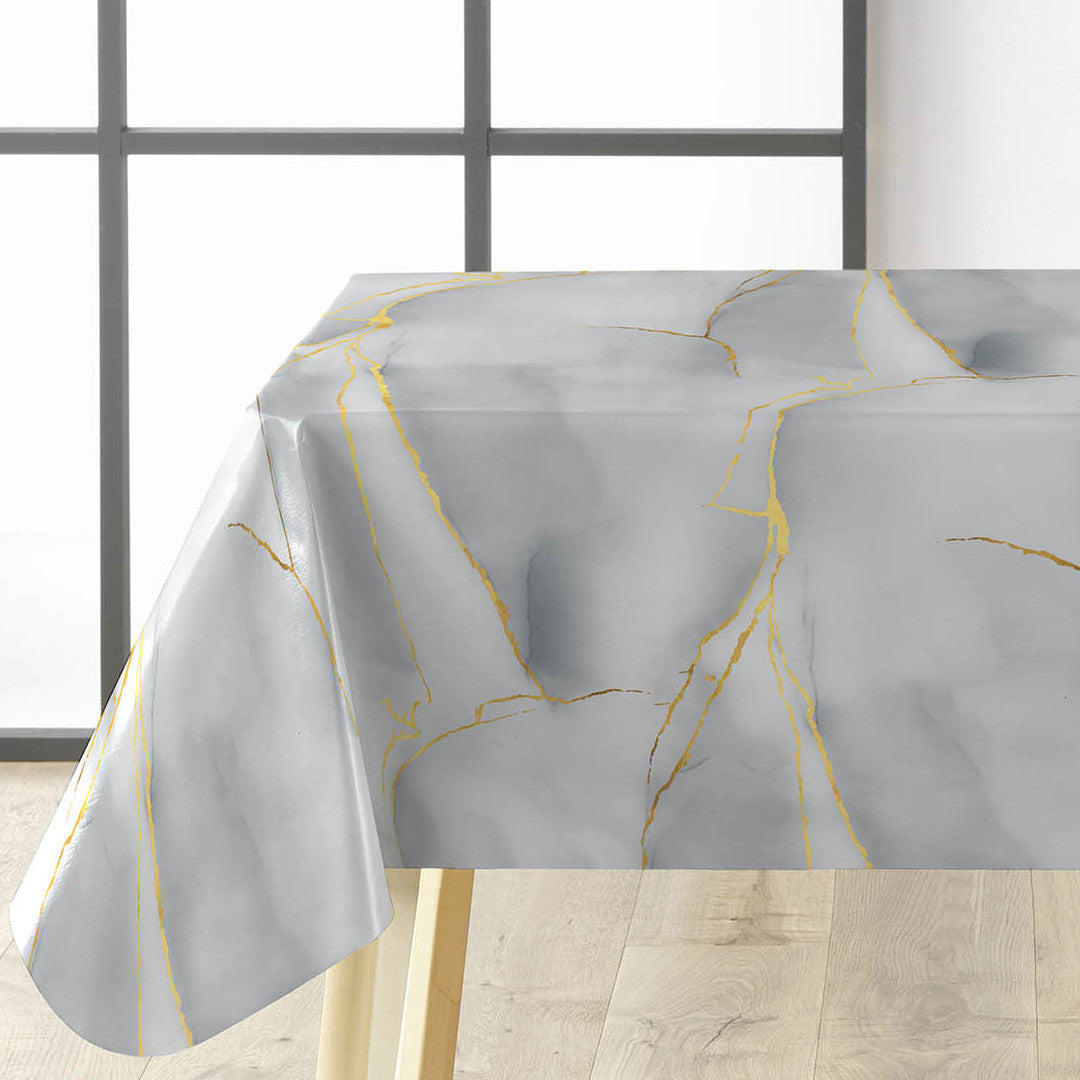 Vil du gi bordet et elegant og samtidig praktisk uttrykk? Da er Textilia Glitter Marbrelle voksduken det perfekte valget. Med sitt vakre marmormønster, gyldne årer og diskrete glitterdetaljer skaper den en spesiell stemning rundt bordet.