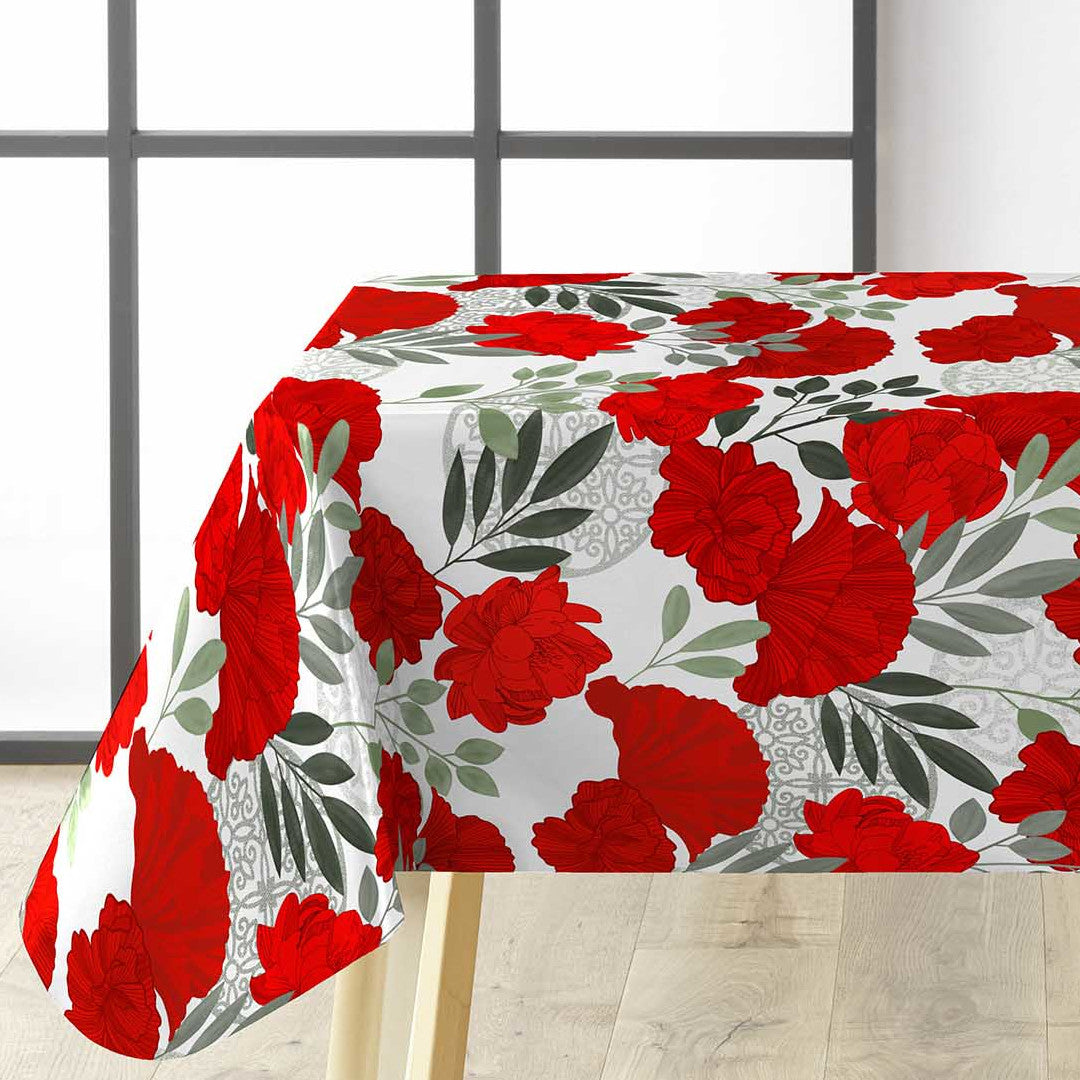 Textilia Occitanie er en markant og stemningsfull voksduk med et illustrert blomstermønster i dype røde nyanser. De store blomstene trer tydelig frem mot den lyse bakgrunnen og gir duken et uttrykk som både er dekorativt og balansert.