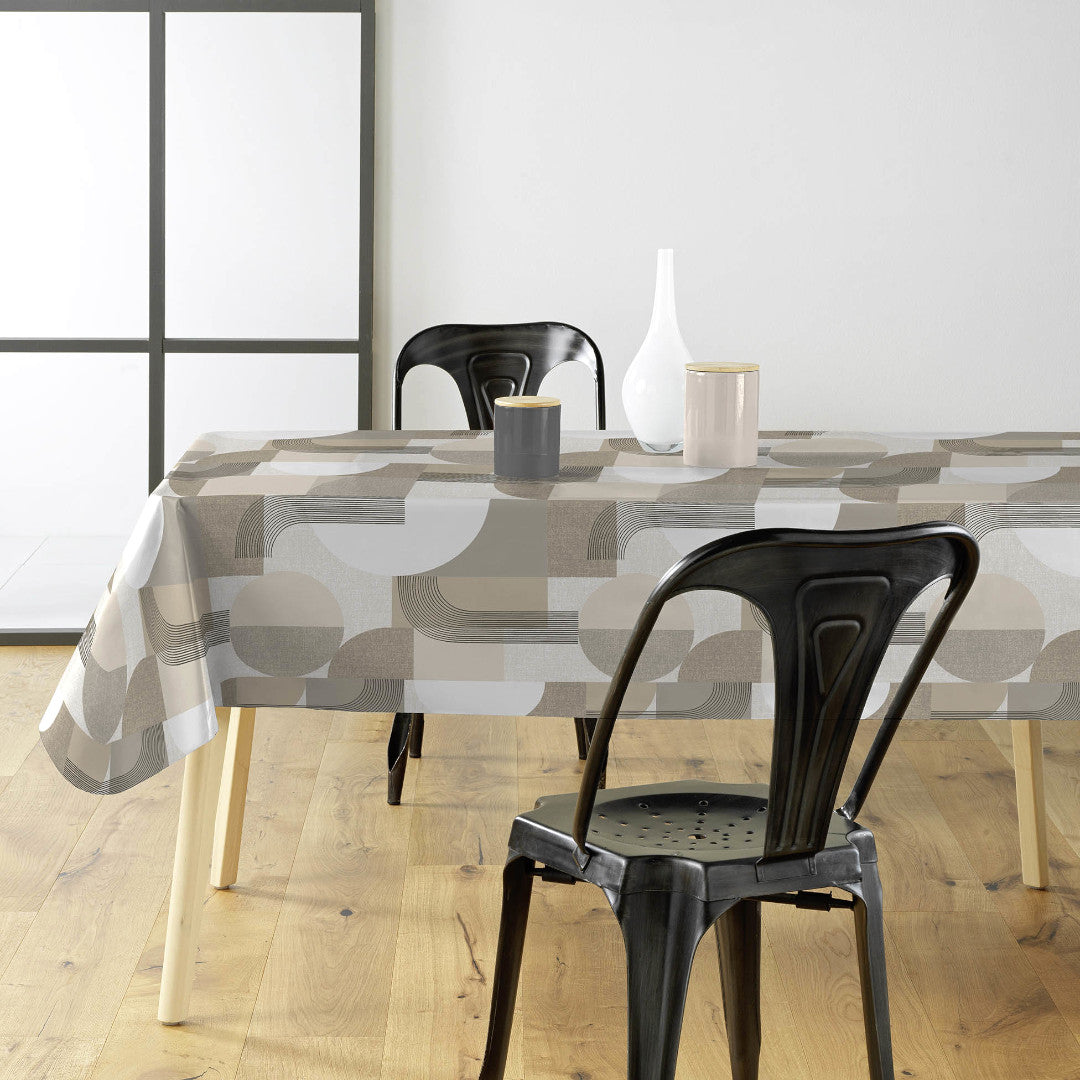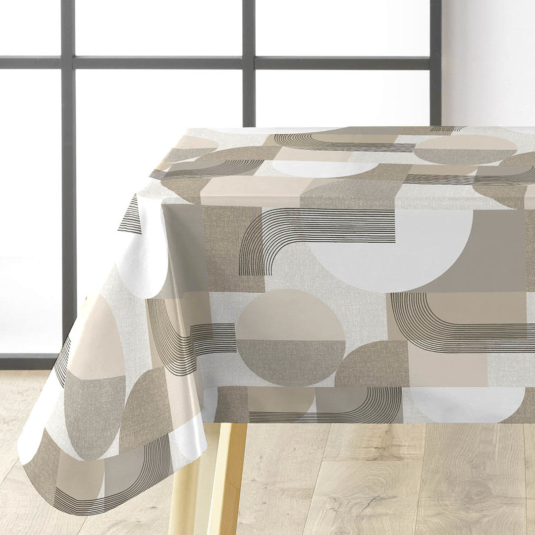 Travis Naturel er en voksduk med glatt overflate og et stilrent, grafisk mønster. Duken består av store sirkler, buede linjer og blokker i lyse, naturlige toner som beige, sand, grå og hvit. Sorte strekdetaljer tilfører en rolig kontrast uten å virke dominerende.