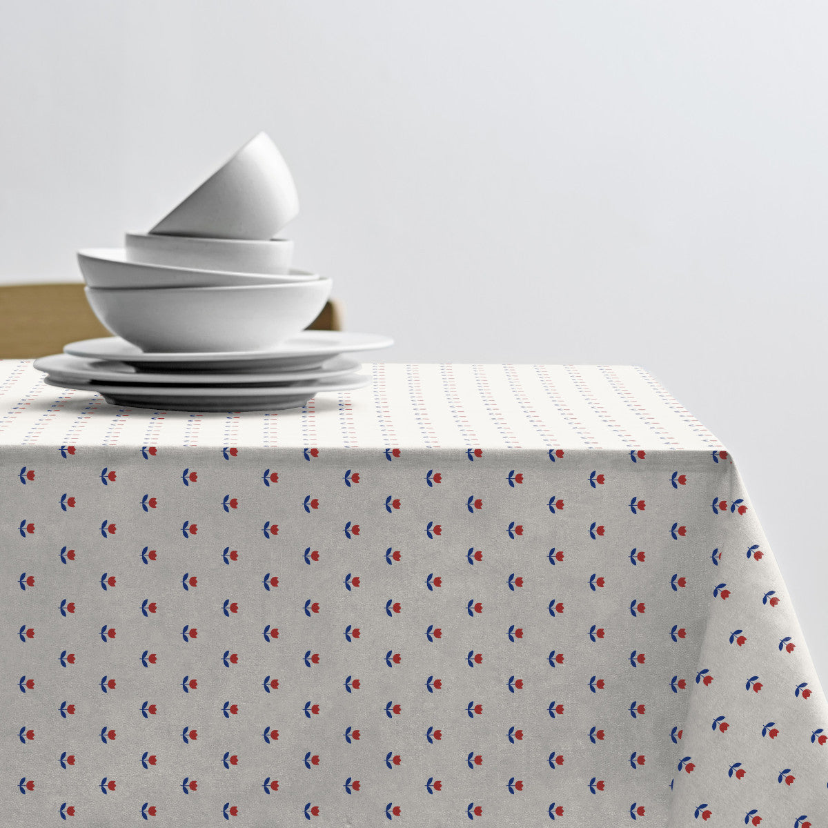 Tulipanenes rytmiske mønster tilfører hjemmet en frisk, nordisk stemning. Akrylduken er både lett å rengjøre og slitesterk – perfekt for daglig bruk og spesielle anledninger.