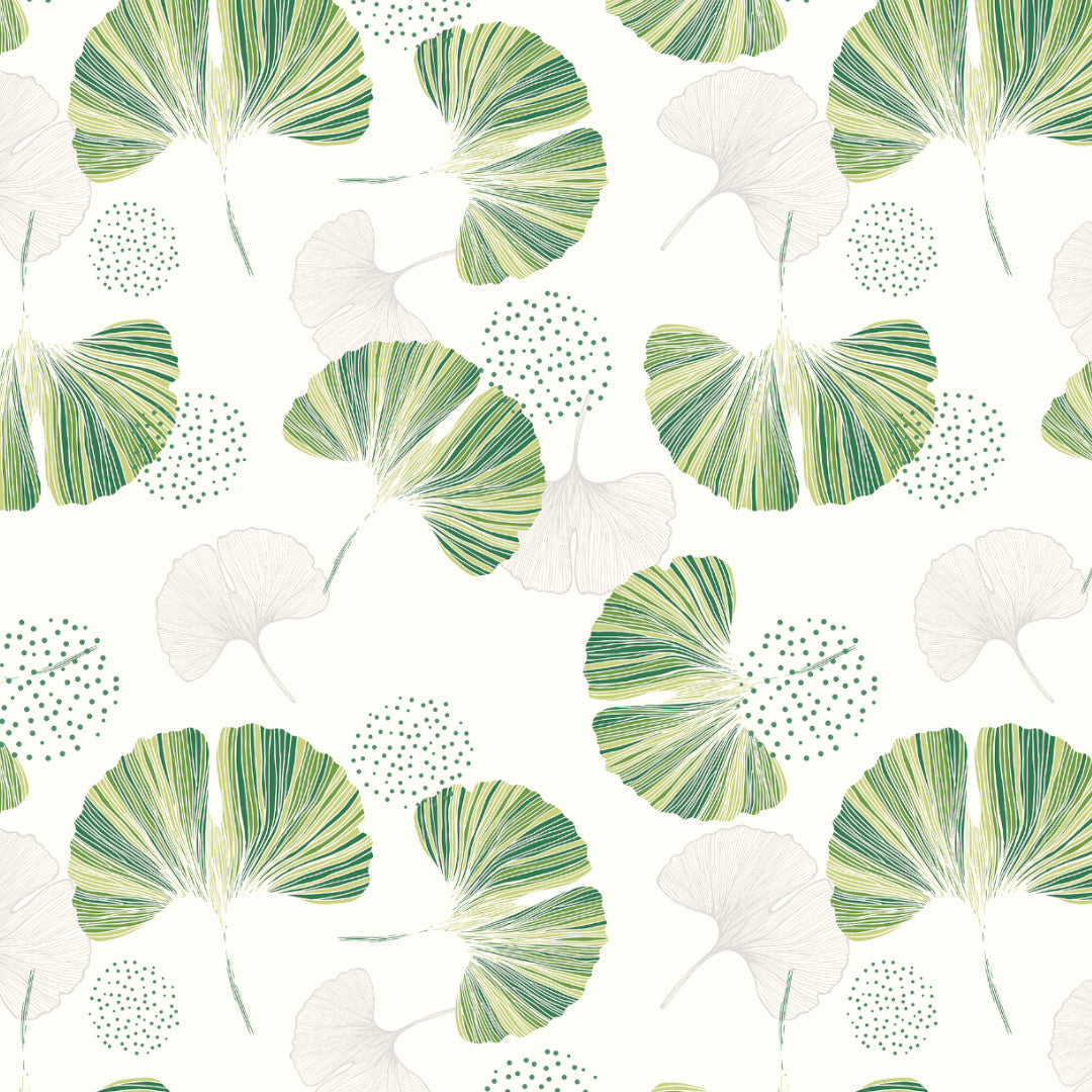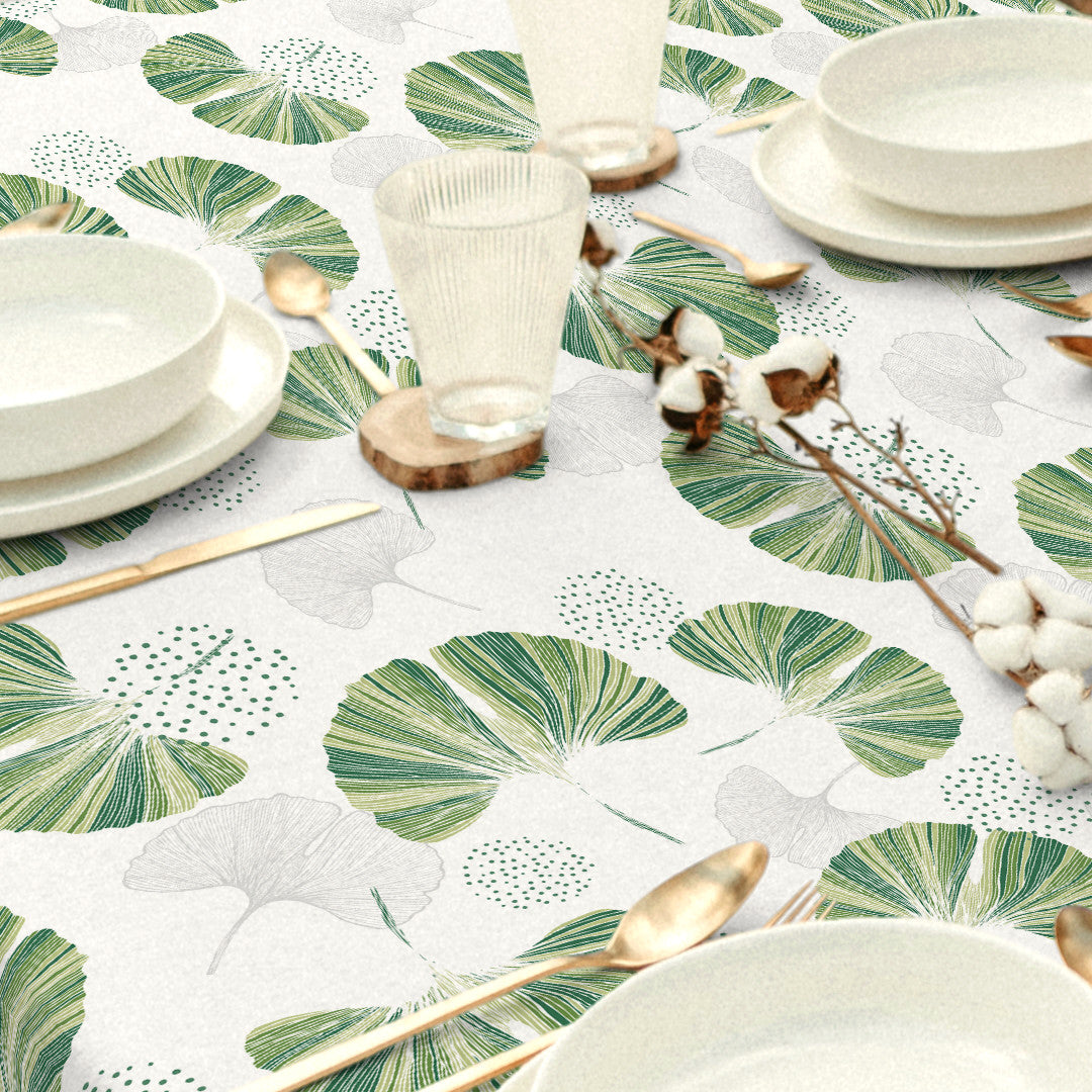 En livlig og samtidig balansert akrylduk med et grafisk bladmotiv i grønne nyanser på en offwhite bakgrunn. De stiliserte bladene minner om ginkgo eller palmeblader og er utført med fine linjer og lette prikkemønstre som gir duken et lett og moderne uttrykk.