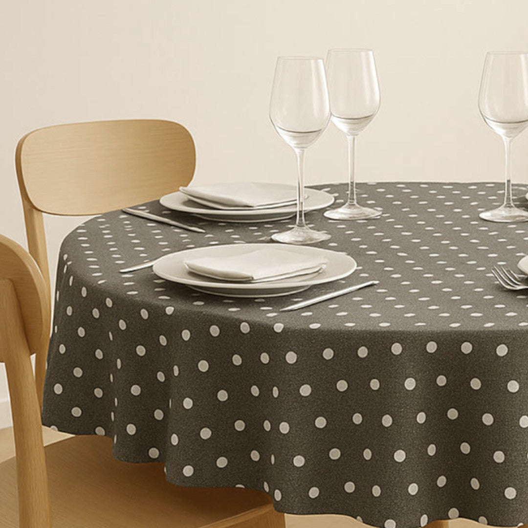 Den mørke, støvede grå nyansen og de lyse prikkene gir et dempet og tidløst uttrykk. Duken har en rolig balanse mellom det grafiske og det klassiske, og passer naturlig inn i både moderne og tradisjonelle rom.