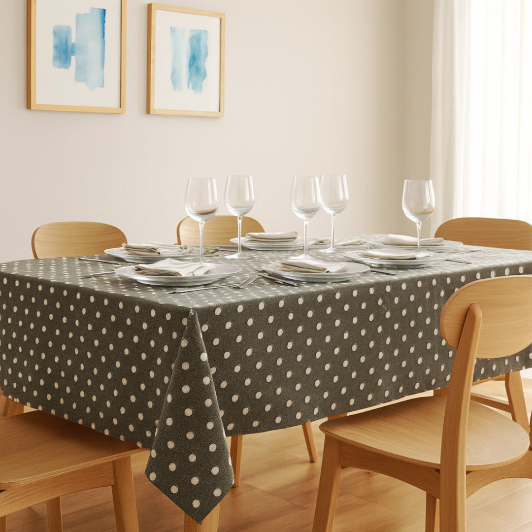 Et klassisk prikkemønster i hvitt på mørk støvet grå bunn gir duken et harmonisk og balansert uttrykk. Fargespillet er rolig og kler både lyst og mørkt treverk.