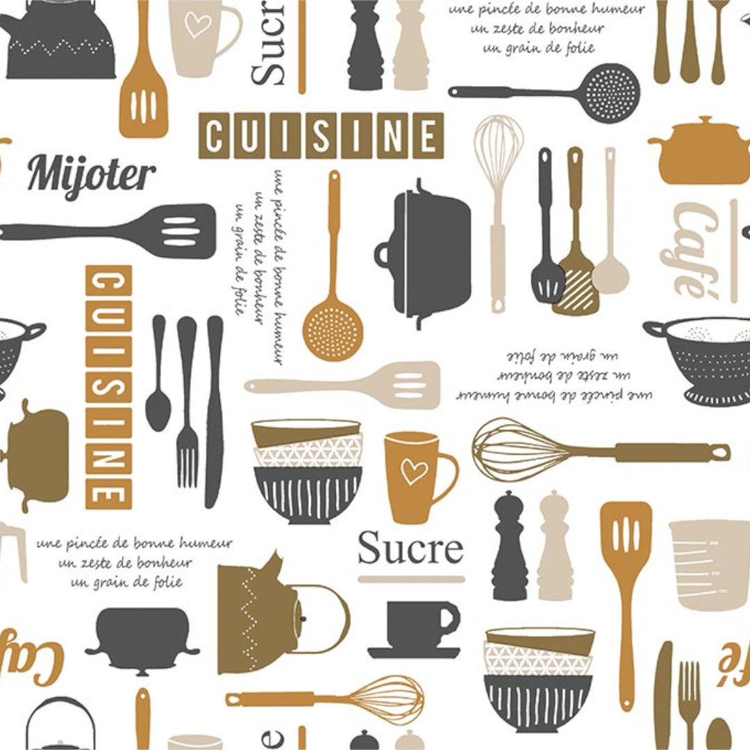 Velkommen til Kjøkkenet – Hvit voksduk med diverse kjøkkenredskaper