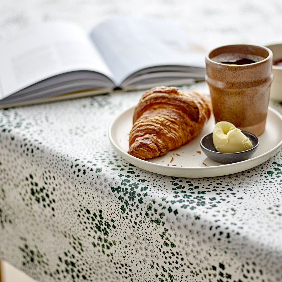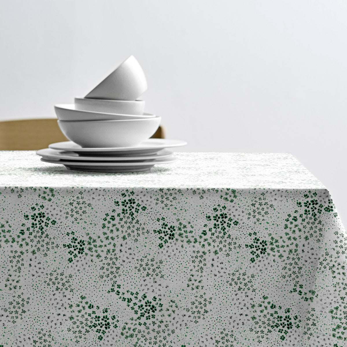 En svärm av små blommor i vackra gröna och grå nyanser. Perfekt beskrivning av denna textilvaxduk från Södahl. Den vita bakgrunden framhäver de små underbara blommorna på ett vackert sätt. På avstånd kan de likna en svärm fjärilar. En duk som sprider glädje och enkel elegans.