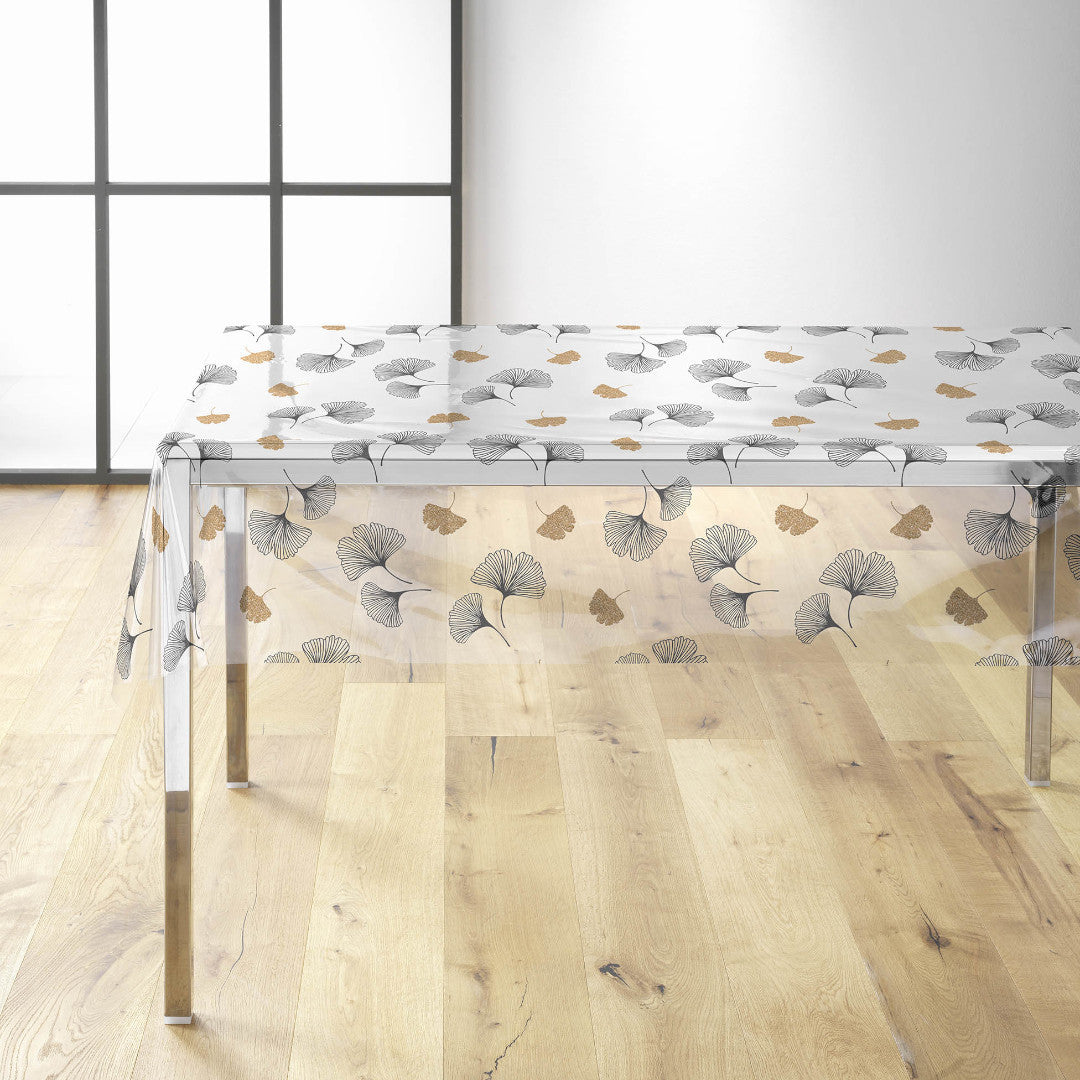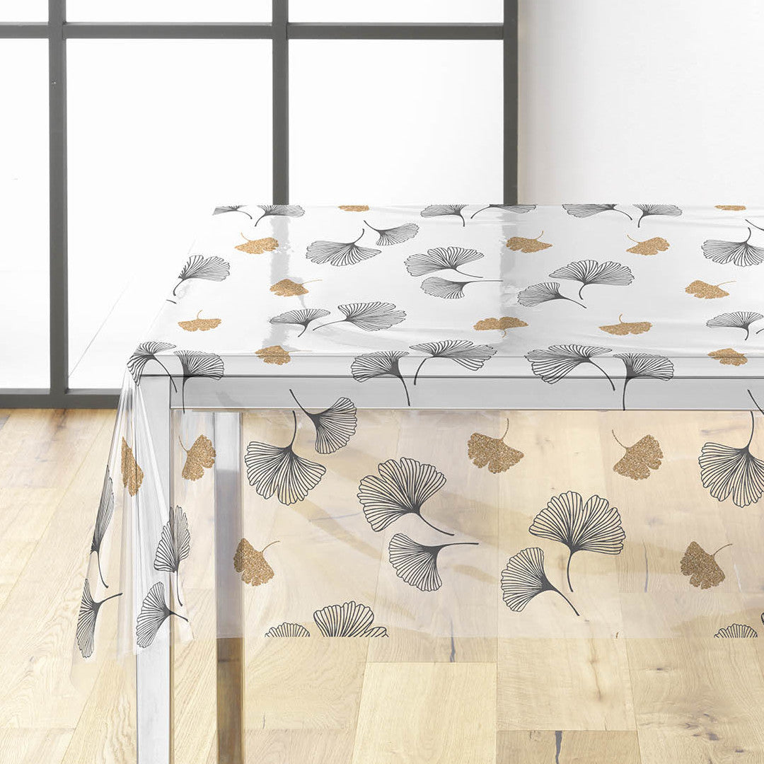 Vil du beskytte bordet ditt og samtidig tilføre et vakkert design? Ylisse gjennomsiktig voksduk er et perfekt valg. De elegante ginkgobladene i svart og gull skaper en moderne og dekorativ effekt som løfter borddekkingen din.
