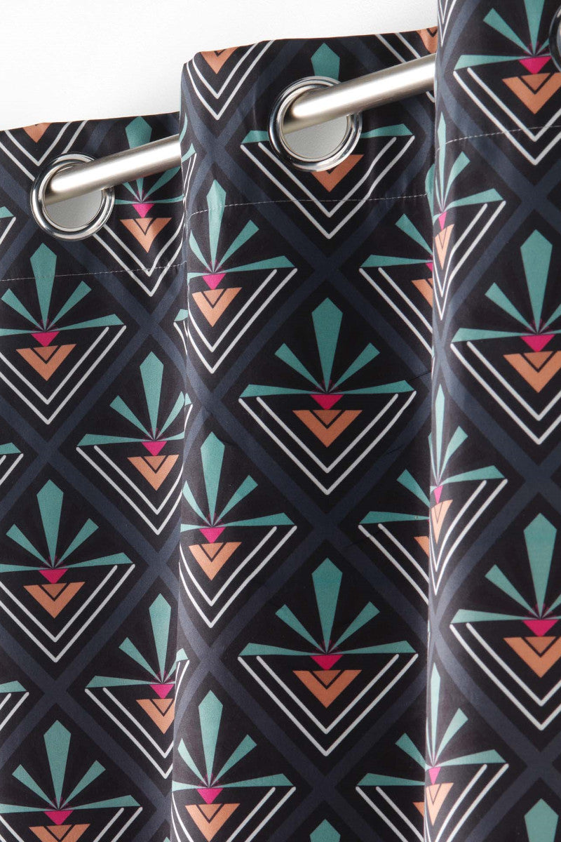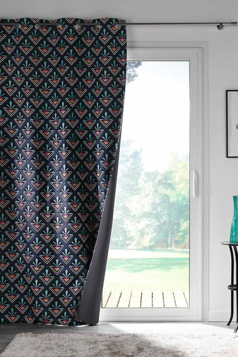 Yuko Blå er et moderne 100 % mørkleggingsgardin med et geometrisk mønster i nyanser av blått, oransje, rosa og hvitt på mørk bakgrunn. Det stilrene designet skaper et spennende visuelt uttrykk som passer perfekt til både soverom, stue og kontor.