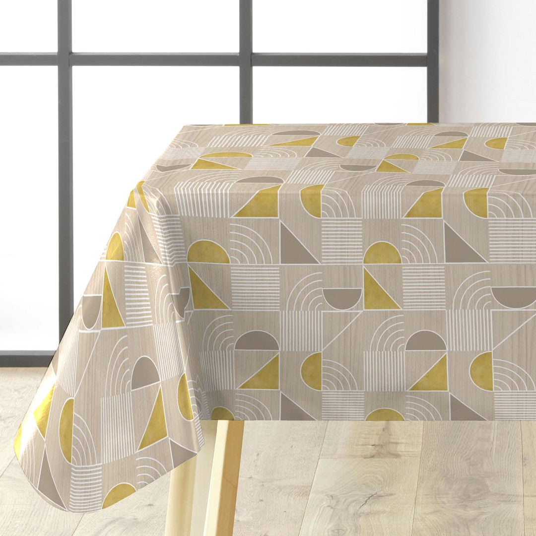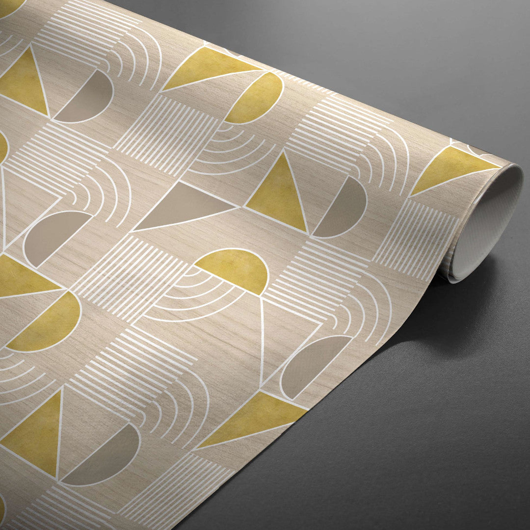 Zelda Luxury Natural er en voksduk med et moderne, grafisk mønster i rolige, naturlige nyanser. Mønsteret består av geometriske former som halvsirkler, linjer og trekanter i dempede gule, beige og sandfargede toner, satt mot en lys trestruktur i bakgrunnen.